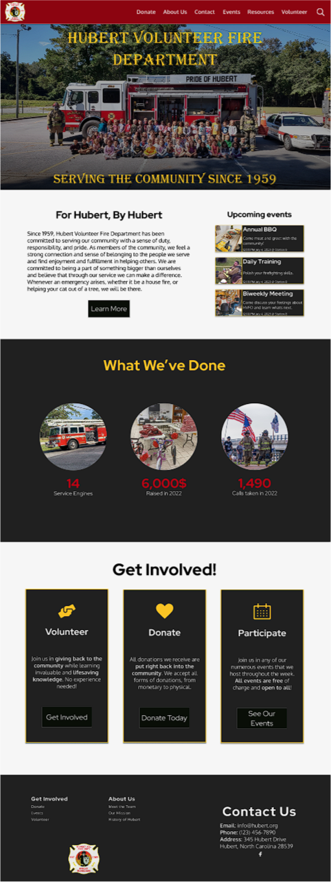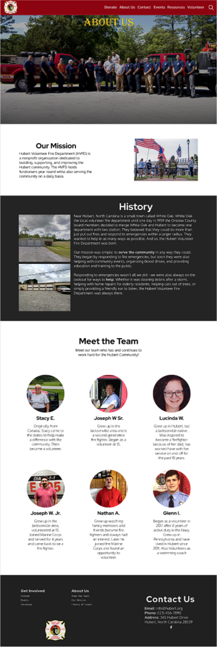 Hubert Volunteer Fire Department (HVFD), is a small volunteer fire department located in Hubert, North Carolina. Their mission is to make their small town a better place in any way possible. One thing HVFD has always struggled with is growing and retaining new members. They believe that it's because of the lack of their online presence. To help them with their mission, my team and I planned to created a website that would allow those who are interested in HVFD to learn about their upcoming events, donate, and volunteer.